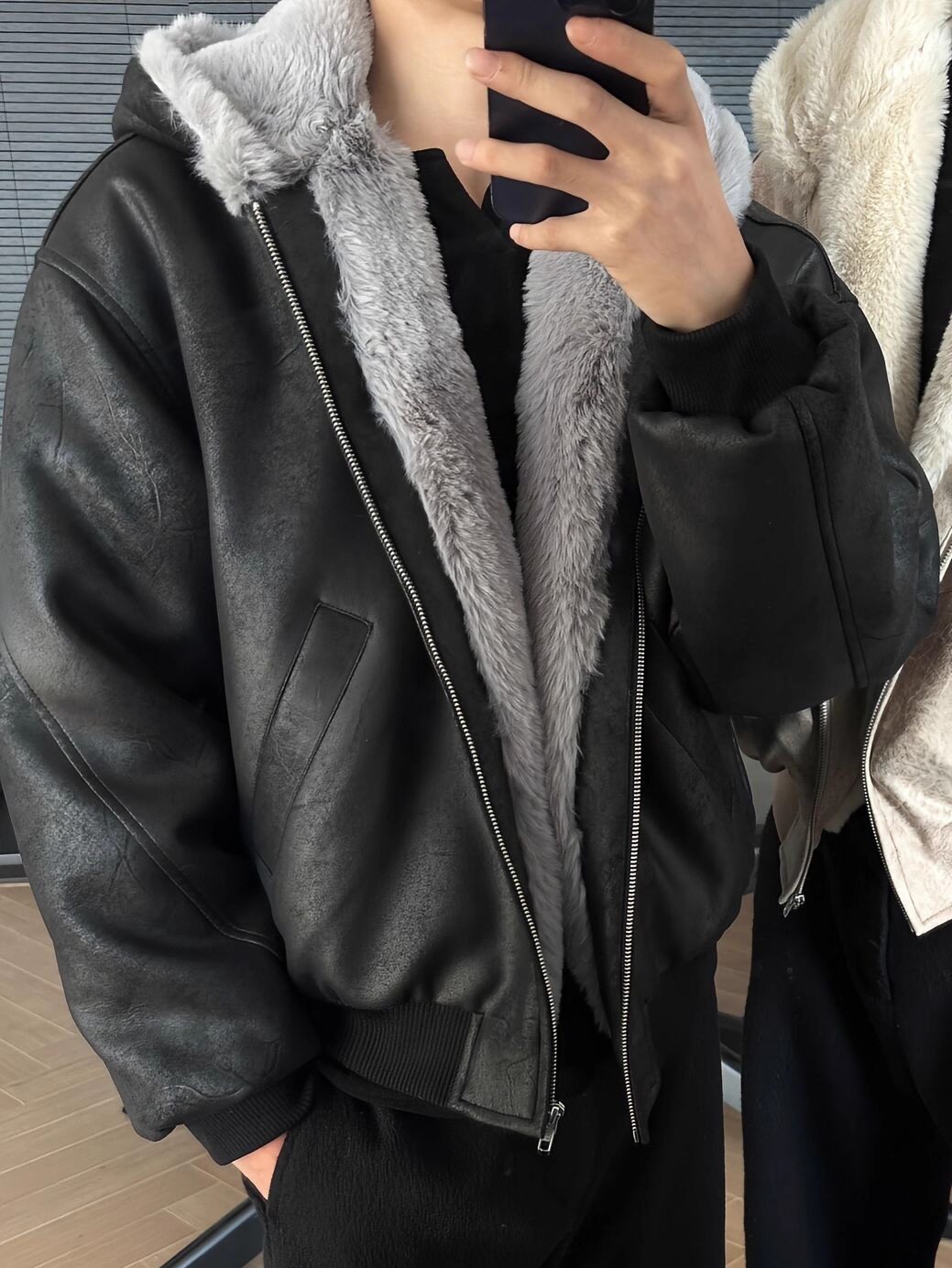 VINTAGE-INSPIRED BLACK LEATHER BOMER | SHERPA-LINED COLLAR & OVERSIZED FIT EHW5014