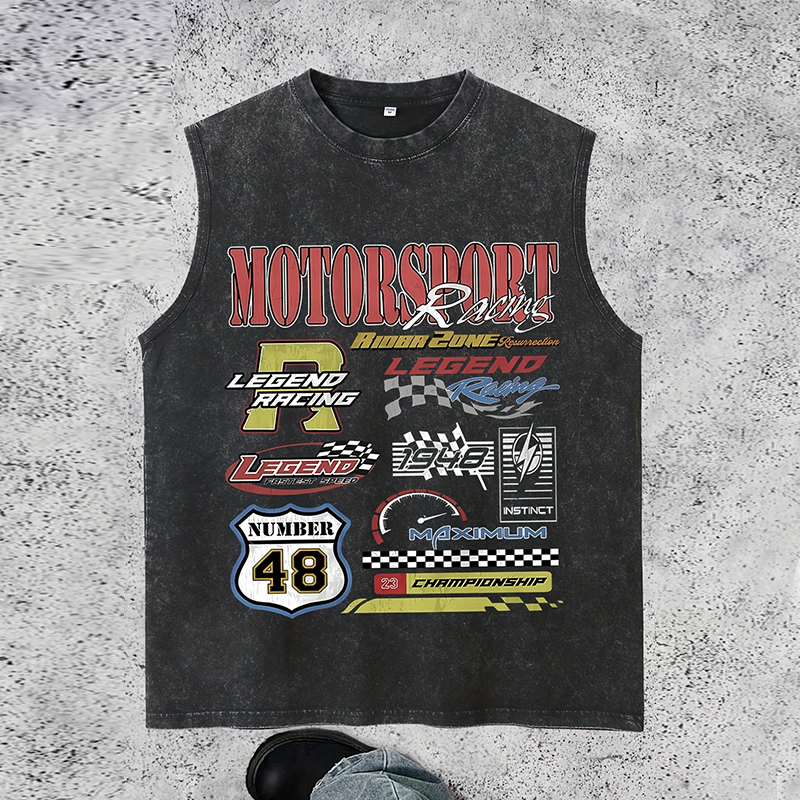 Street Washed Distressed Racing Print Sleeveless T-Shirt