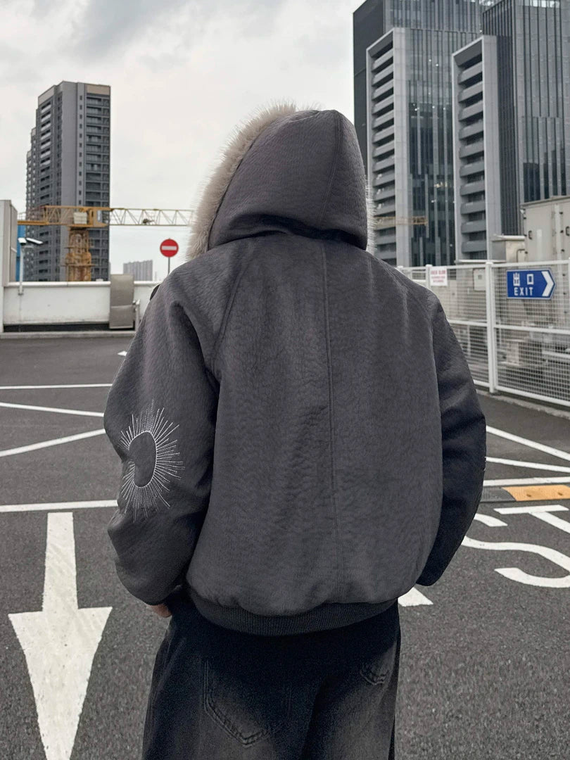 FAUX SHEARLING HOODED JACKET-FUZZY COLLAR&CONTRAST DETAILS, OVERSIZED WARM OUTWEAR EHW5018