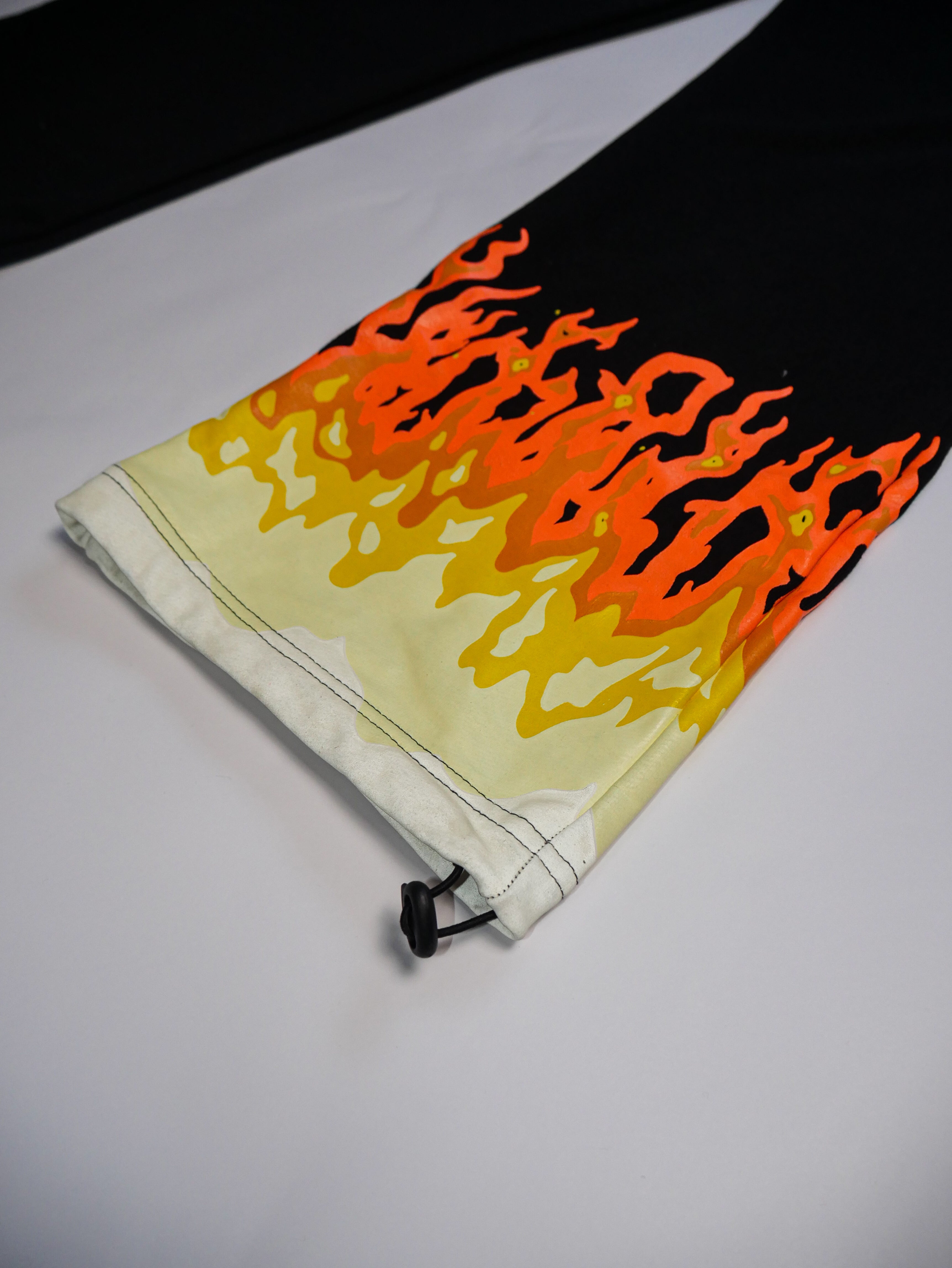 - Fiery orange-to-yellow flame embroidery at the hem—bold gradient flames that POP against the sleek black base